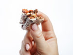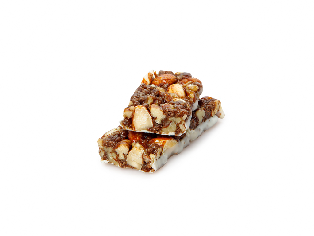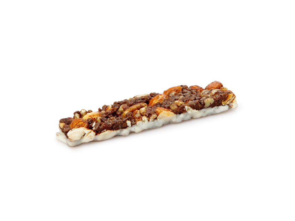 Two of your favorite kinds of nuts, popped rice and prunes, covered with a thin layer of white icing, form an original flavor combination that can surprise even the pickiest of eaters. The bar contains 20% of protein and absolutely no sugar or gluten.